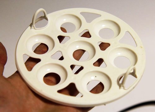 Под крышкой находится специальная подставка с углублениями, которые предназначены для устойчивого положения яиц. Подставка легко снимается, это нужно, чтобы периодически добавлять немного воды в кольцевую канавку для поддержания оптимальной влажности внутри прибора.