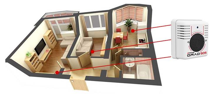Одна из возможных схем установки нескольких приборов в обычной квартире для достижения максимального эффекта отпугивания