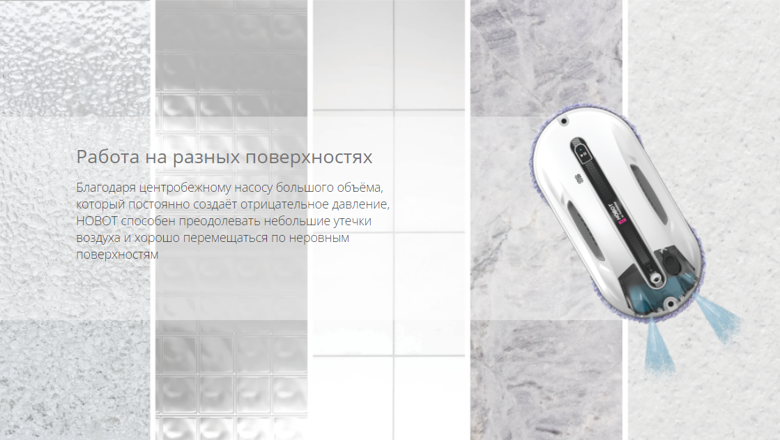 Высокая сила притяжения робота к поверхности (до 5кг) способна удержать в пять раз больший чем вес робота (1 кг). Благодаря этому Hobot-R3 надёжно удерживается на вертикальных поверхностях и эффективно удаляет пыль и грязь